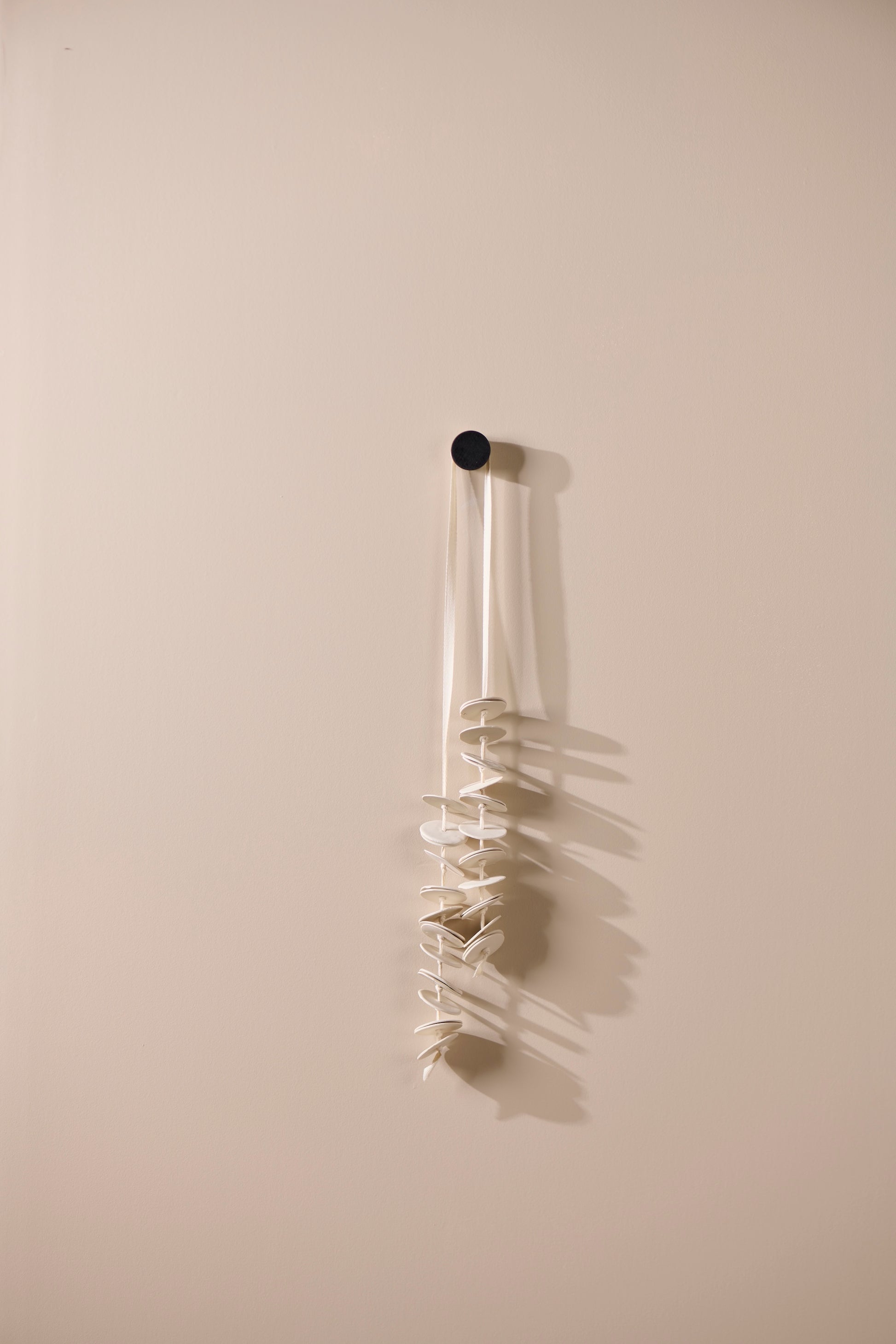 Cadence 2 balances scale and subtlety, recalling the sight of fishing lines suspended in boat houses. Handmade porcelain discs, strung on twill tape, fall in a vertical line from a single knob. Fired without glaze, they reveal the raw, tactile finish of porcelain, marked by process and variation.