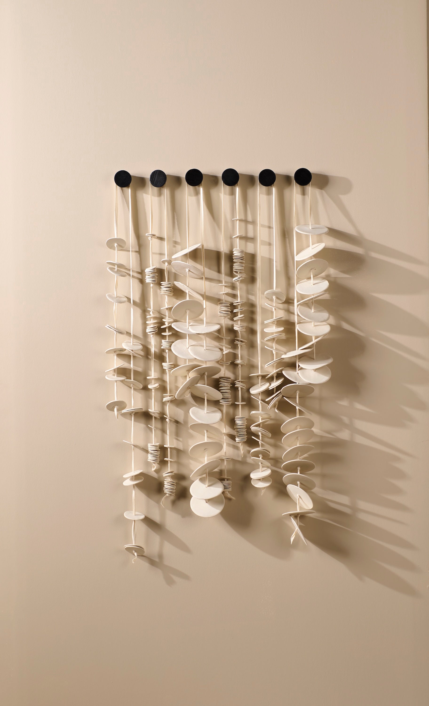 Cadence 6 transforms repetition into rhythm, drawing inspiration from fishing buoys and lines hung in boat houses and harbors. Dozens of porcelain discs are shaped and finished by hand, then strung on twill tape to gather across six knobs. Fired without glaze, the porcelain surface remains raw and tactile, each disc carrying subtle marks of touch and process.
