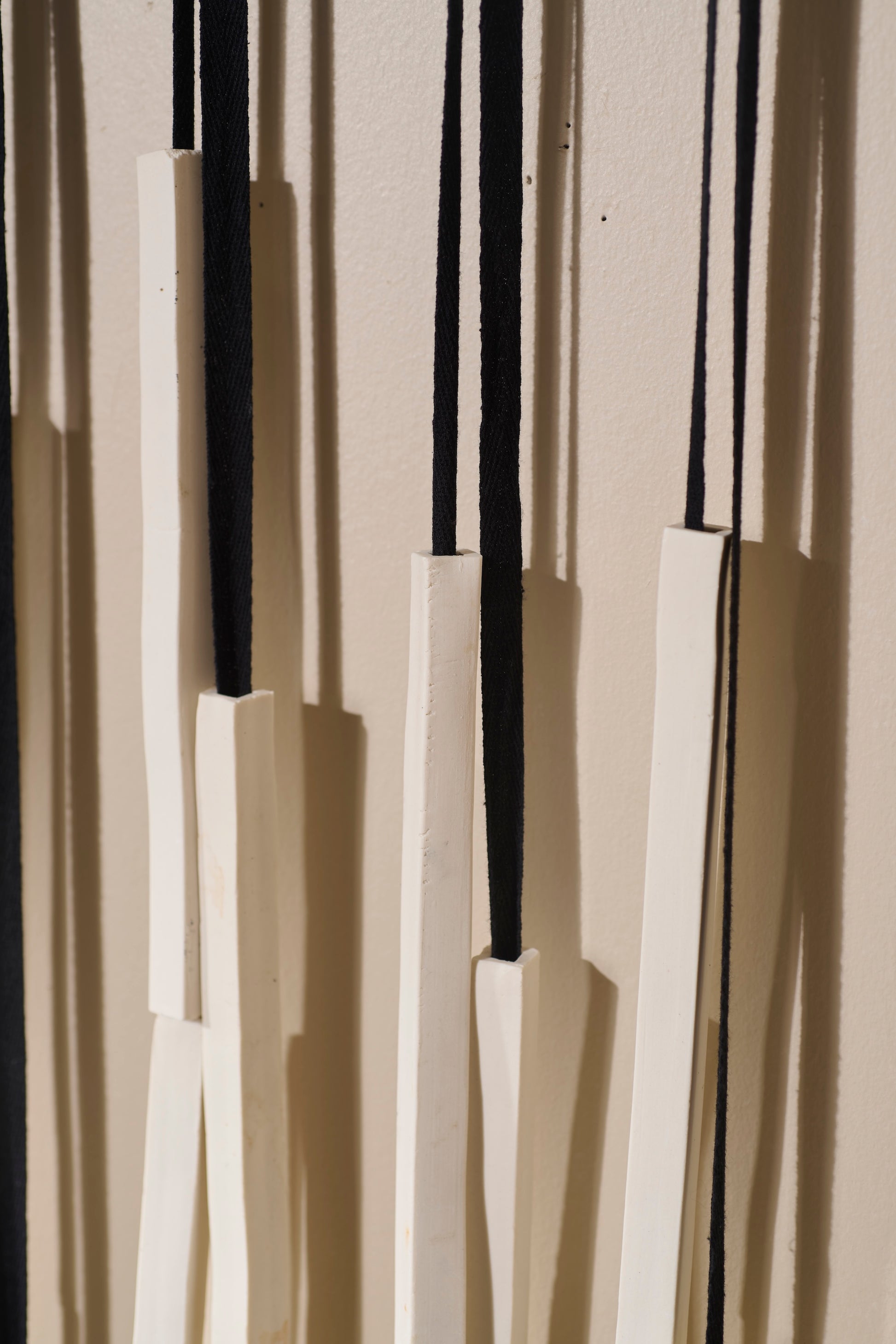 Counterpoint 2 brings the rhythm of the coast indoors, recalling lines of buoys or nets hanging in harbors. Handmade porcelain discs, each formed and finished individually, are strung on twill tape and left unglazed for a raw, tactile surface. Hung from a single knob, the strand creates a sculptural vertical gesture—compact in length but full of presence.