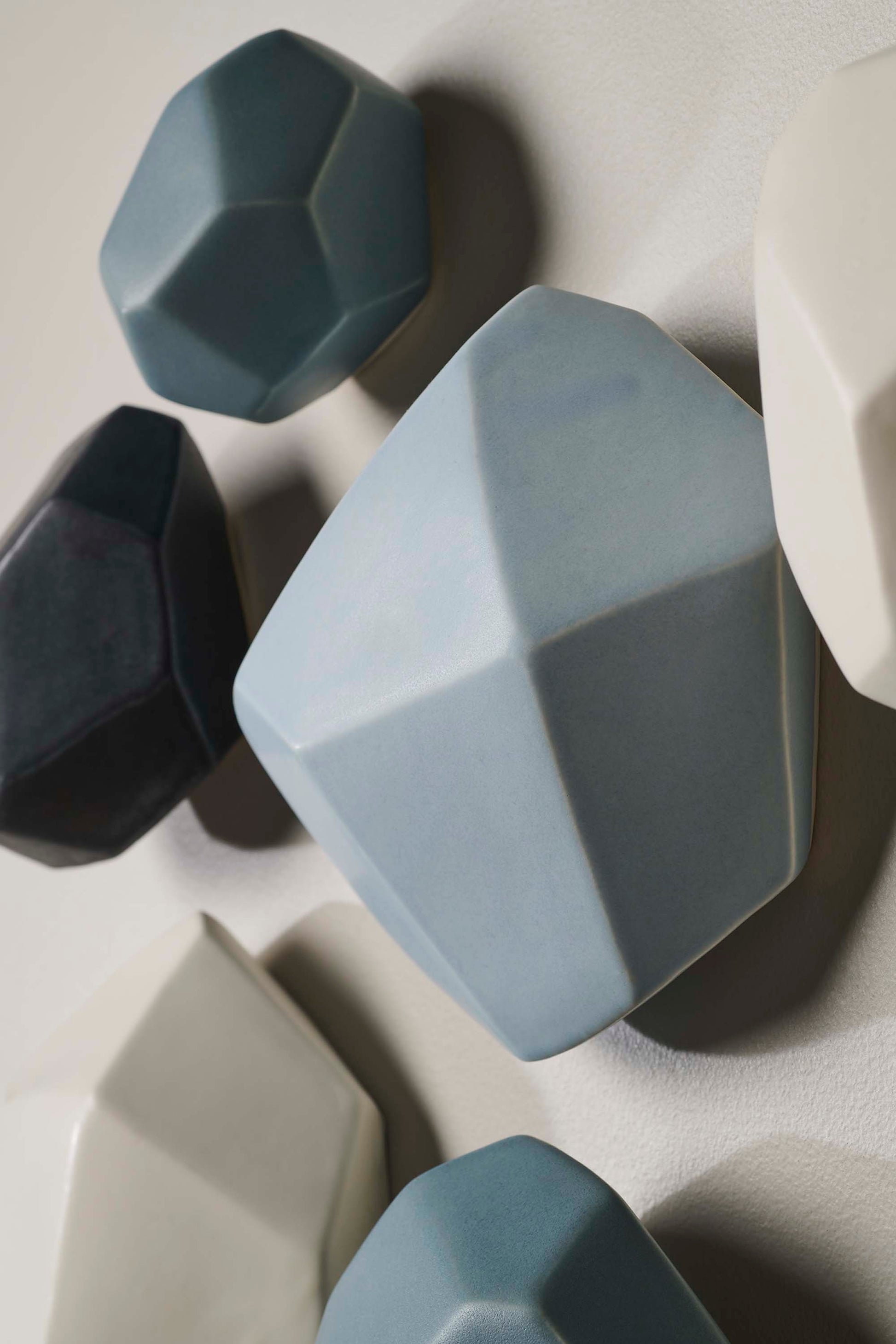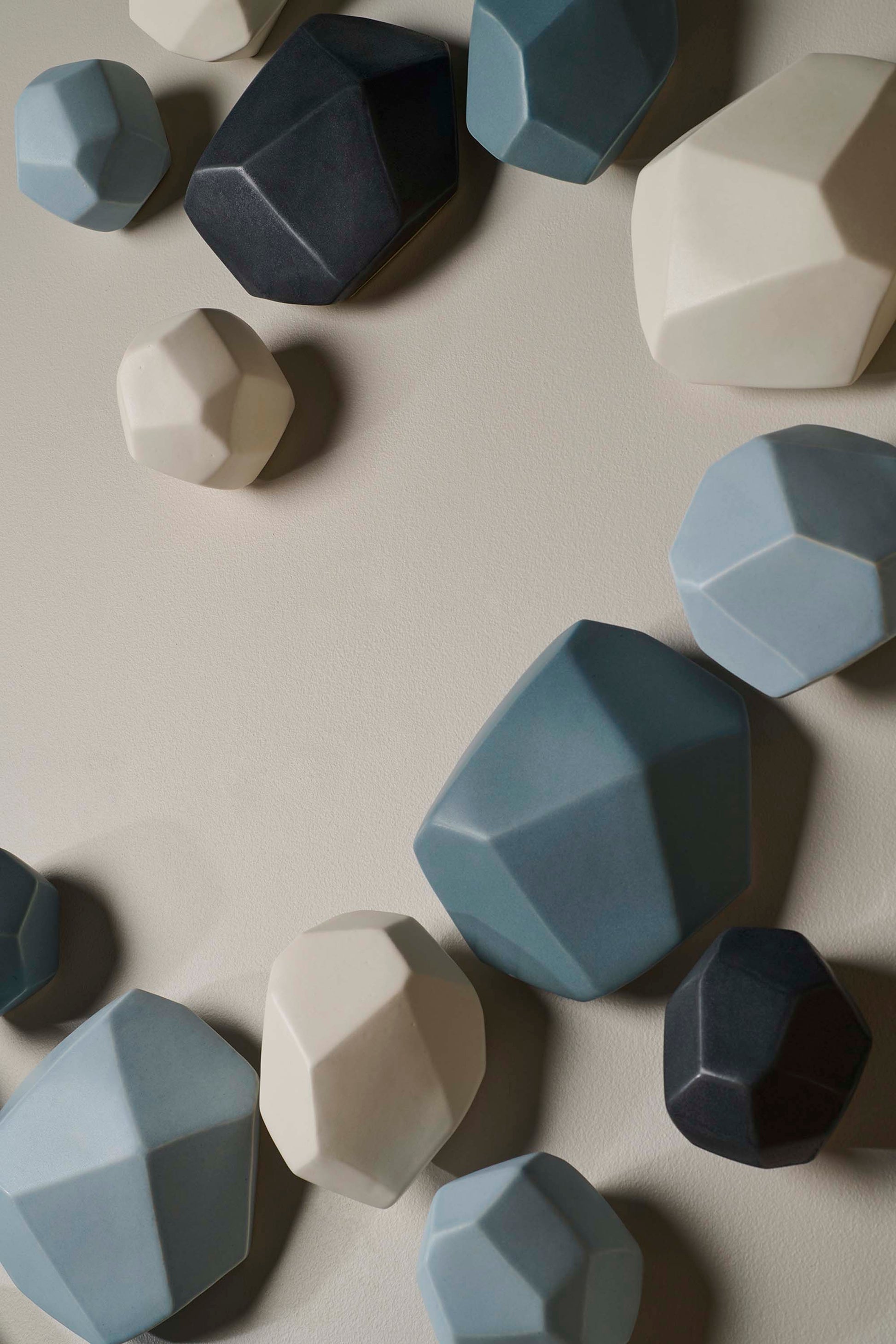 Wall Stones form a cascading composition across the wall, recalling the beauty of beach finds worn smooth by water and time. Each geometric stone is slipcast in porcelain and glazed by hand, carrying subtle variation in surface and tone. Offered in three sizes, the stones can be arranged in endless ways—falling like a tide line, gathered in clusters, or flowing in rhythm across a wall. With colors reminiscent of beach glass, Wall Stones bring both clarity and softness to a space, creating a sculptural installation that shifts with light.