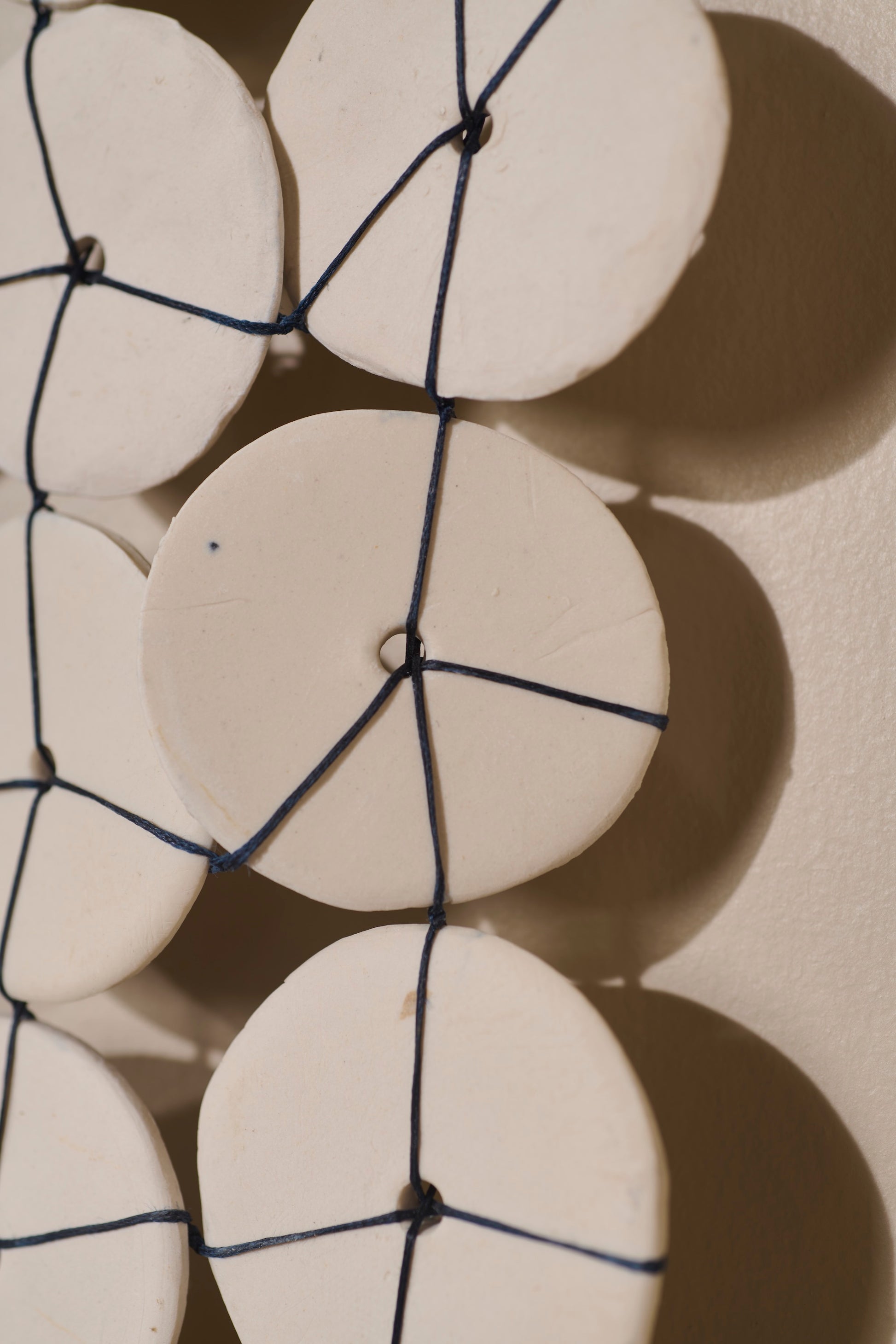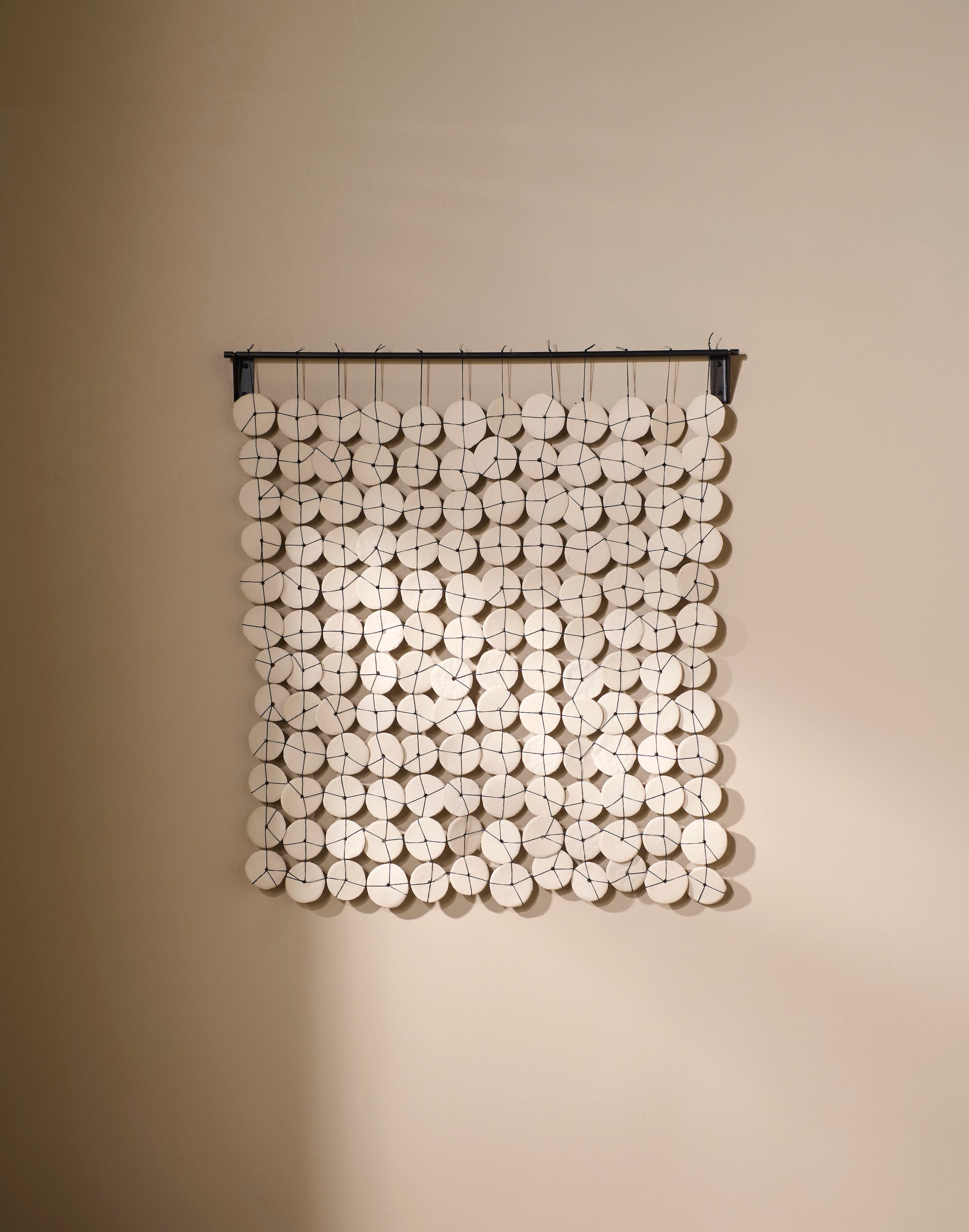 Woven 1 explores the language of textiles through porcelain. Handmade discs, each formed and finished by hand, are knotted into a grid and suspended from a custom 36" metal bar. Fired without glaze, the discs retain a raw, tactile surface that records touch and variation.